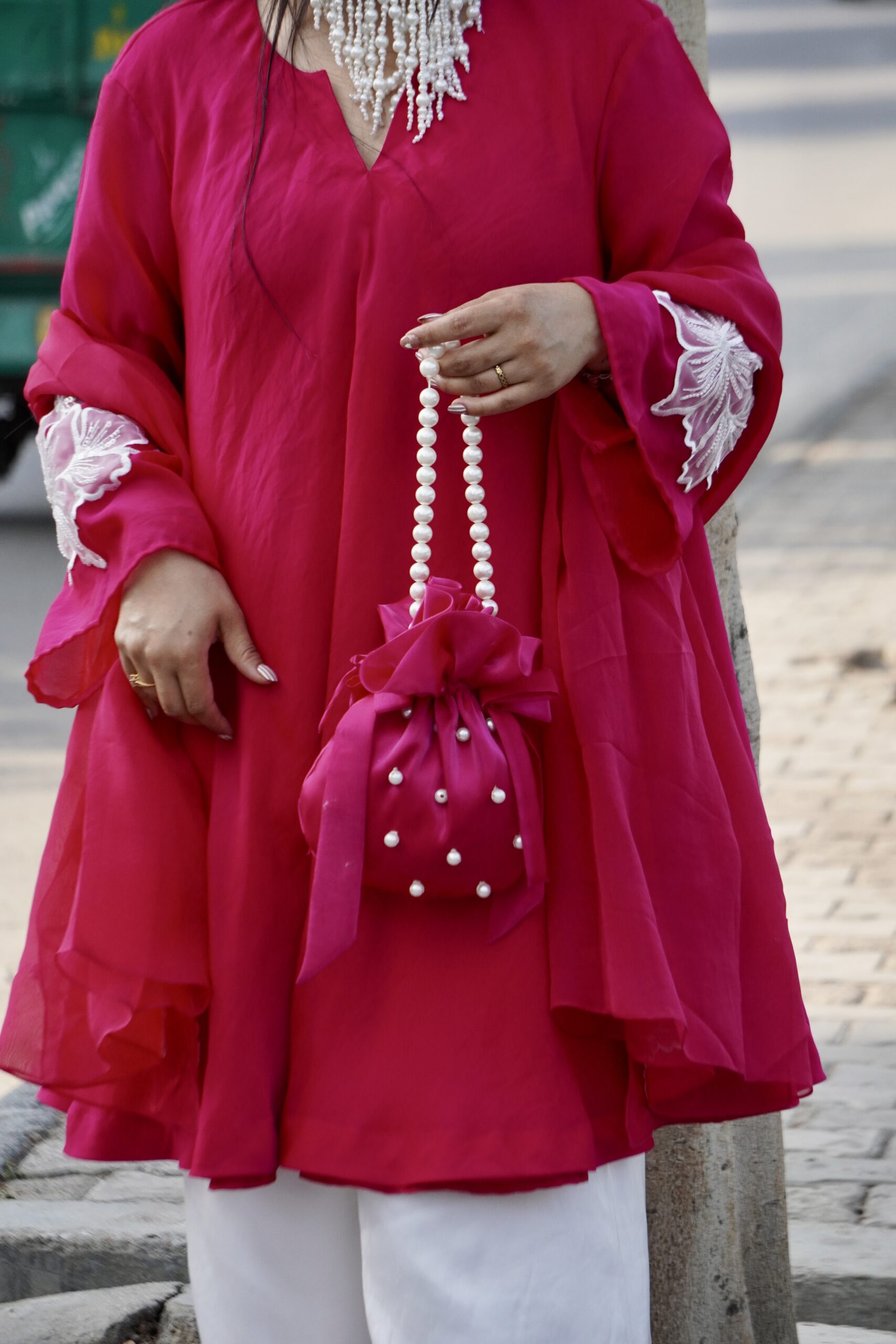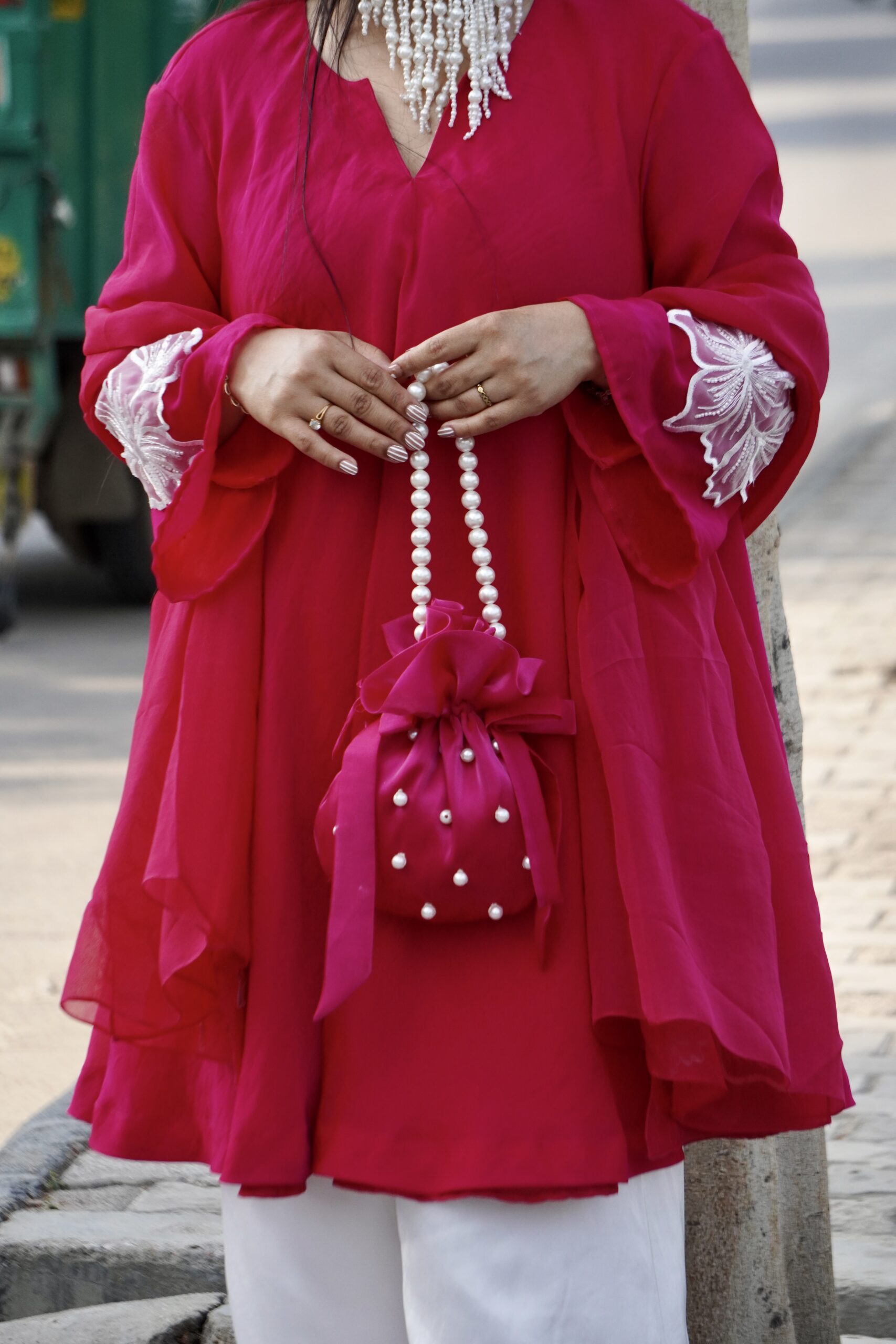 The drawstring closure ensures ease of use, while the pearl-beaded handle offers both comfort and sophistication. Perfect for weddings, receptions, and festive celebrations, this potli is designed for women who love timeless style with a modern touch.