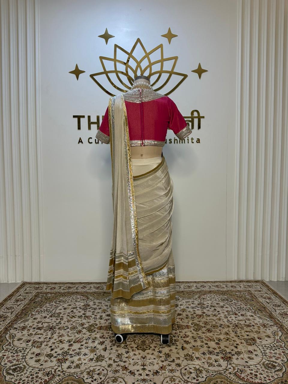 The subtle off-white base combined with the bold pink accent creates a perfect balance of elegance and statement style, ideal for weddings, festive events, and traditional functions.