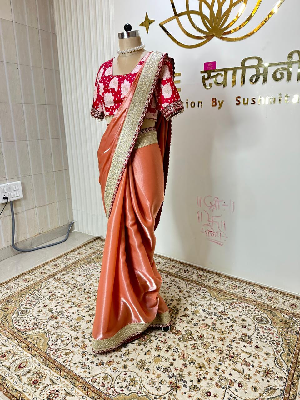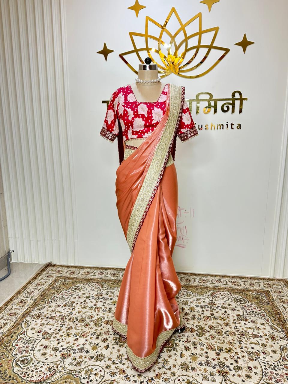 • Vibrant orange draping saree with elegant fall