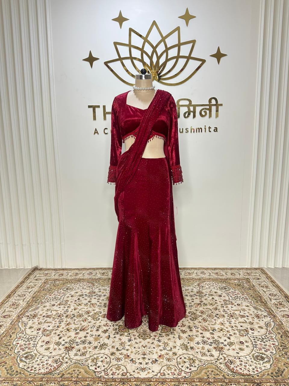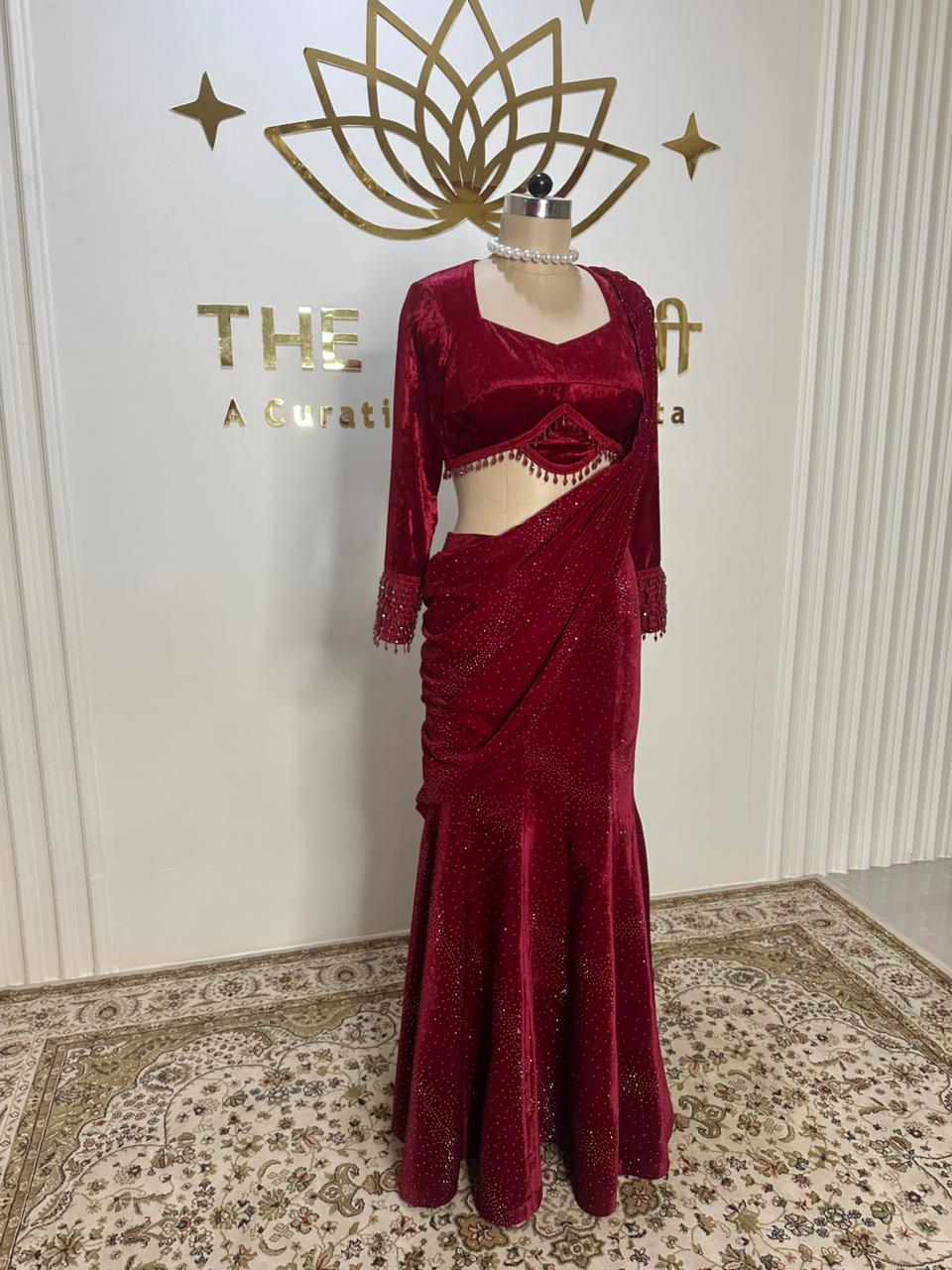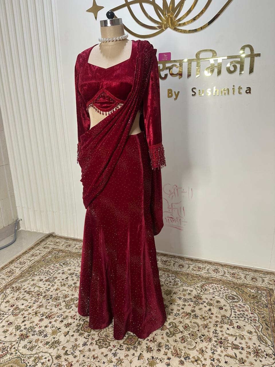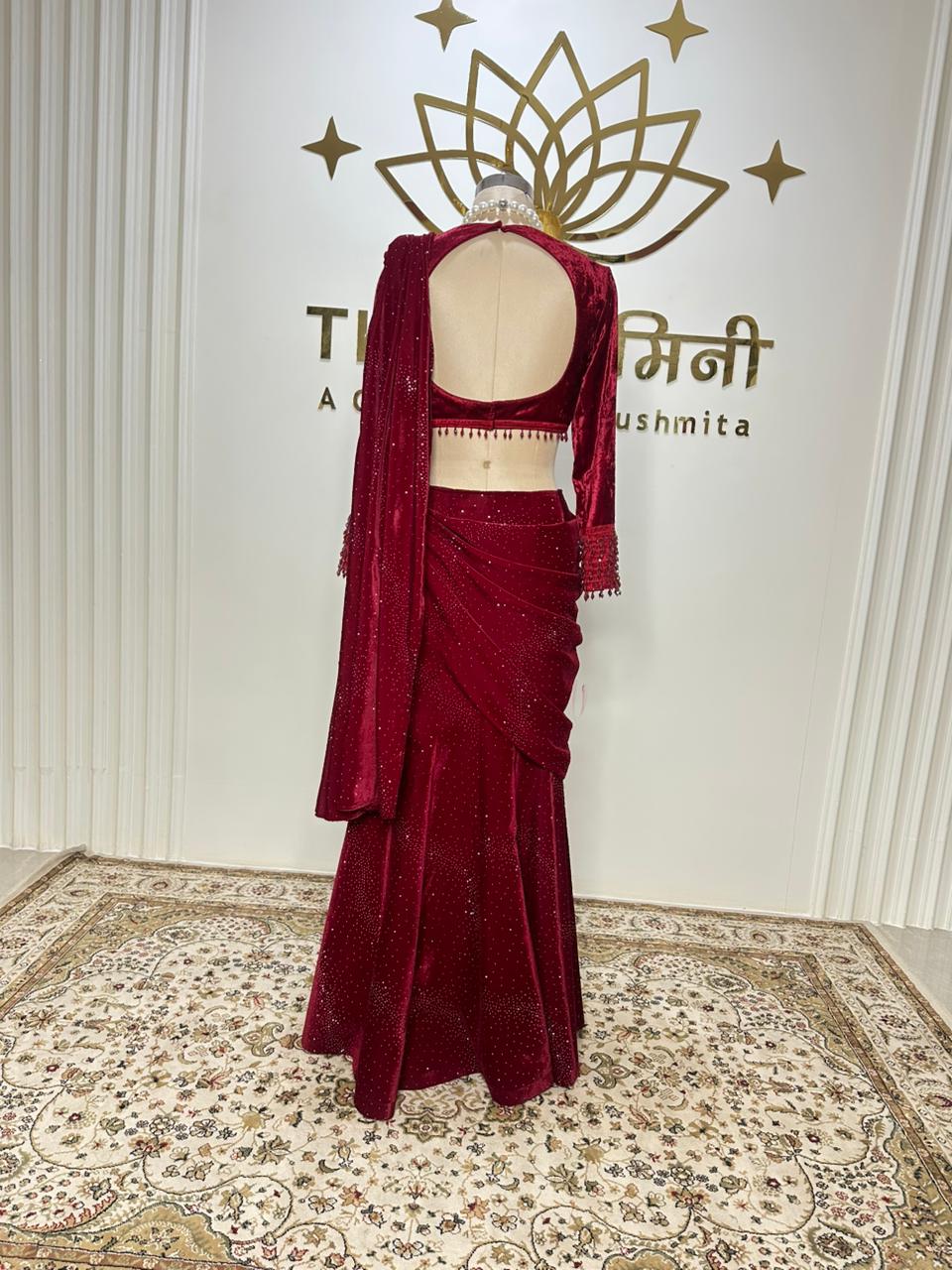 Red Velvet Skirt Saree SetRed Velvet Skirt Saree Set