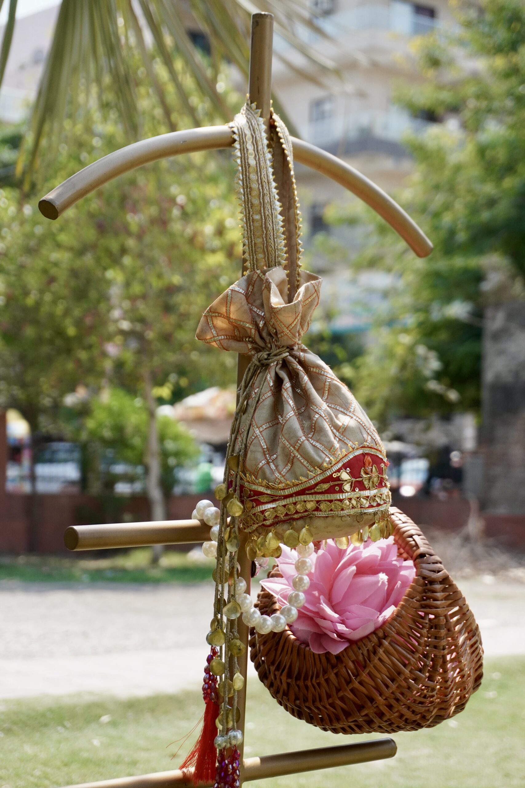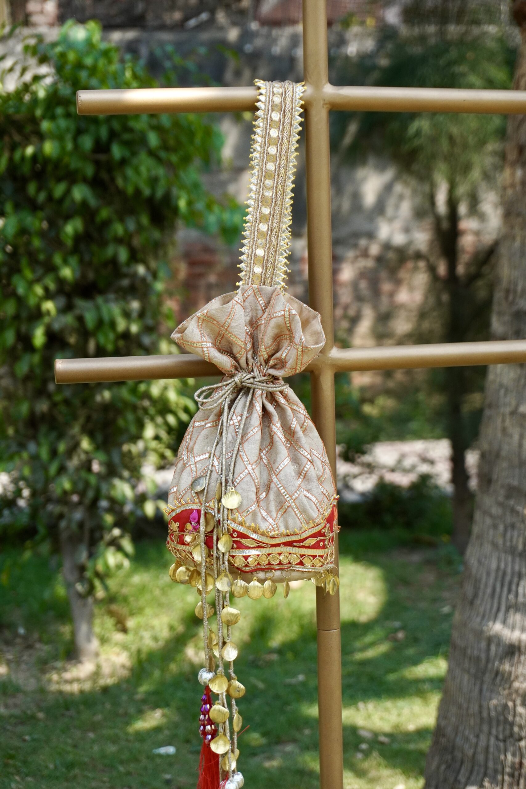Designed with a pearl-beaded handle and traditional drawstring closure, this potli is perfect for weddings, receptions, and bridal functions. Its timeless color combination makes it easy to pair with lehengas, sarees, and Indo-western outfits.