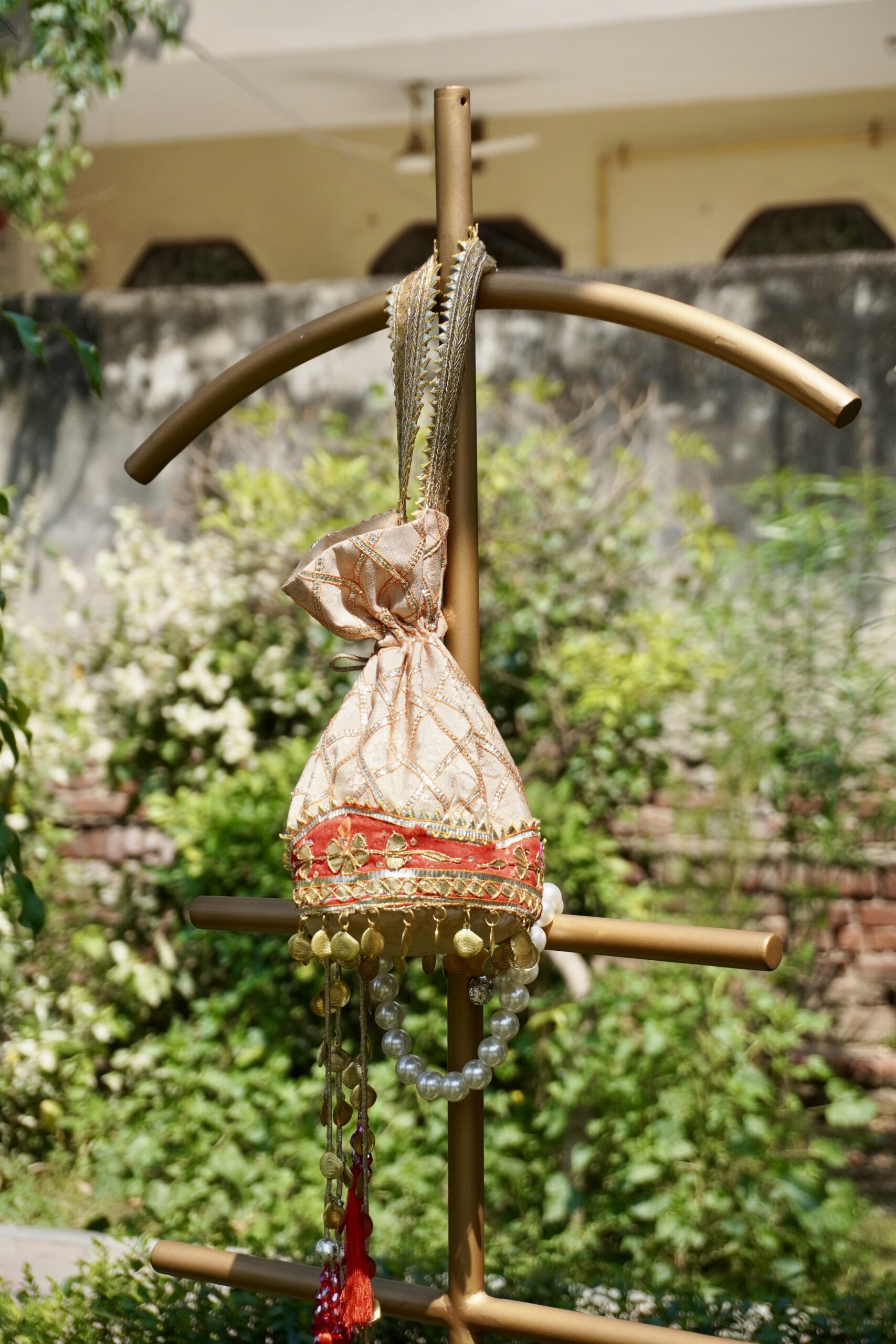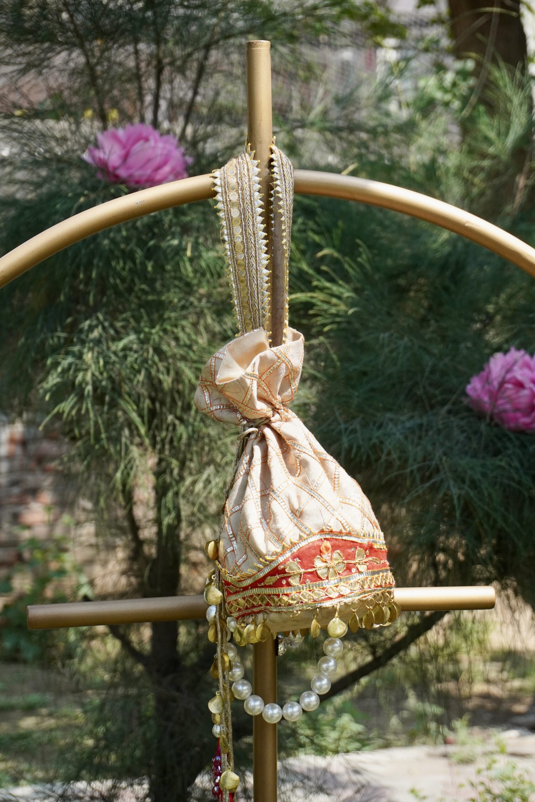 Step into elegance with the Swamini Royal Zari Pearl Bridal Potli Bag, crafted in a soft beige base and adorned with intricate zari embroidery. The rich red border with golden detailing and delicate hanging embellishments adds a royal festive charm.