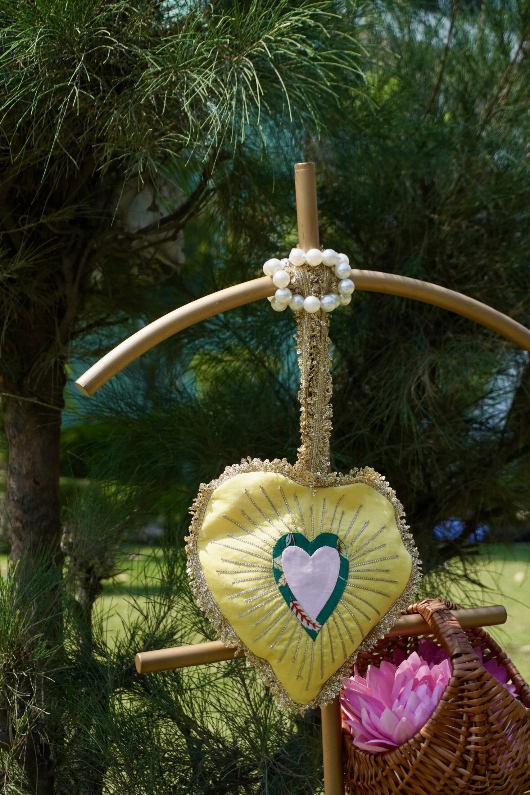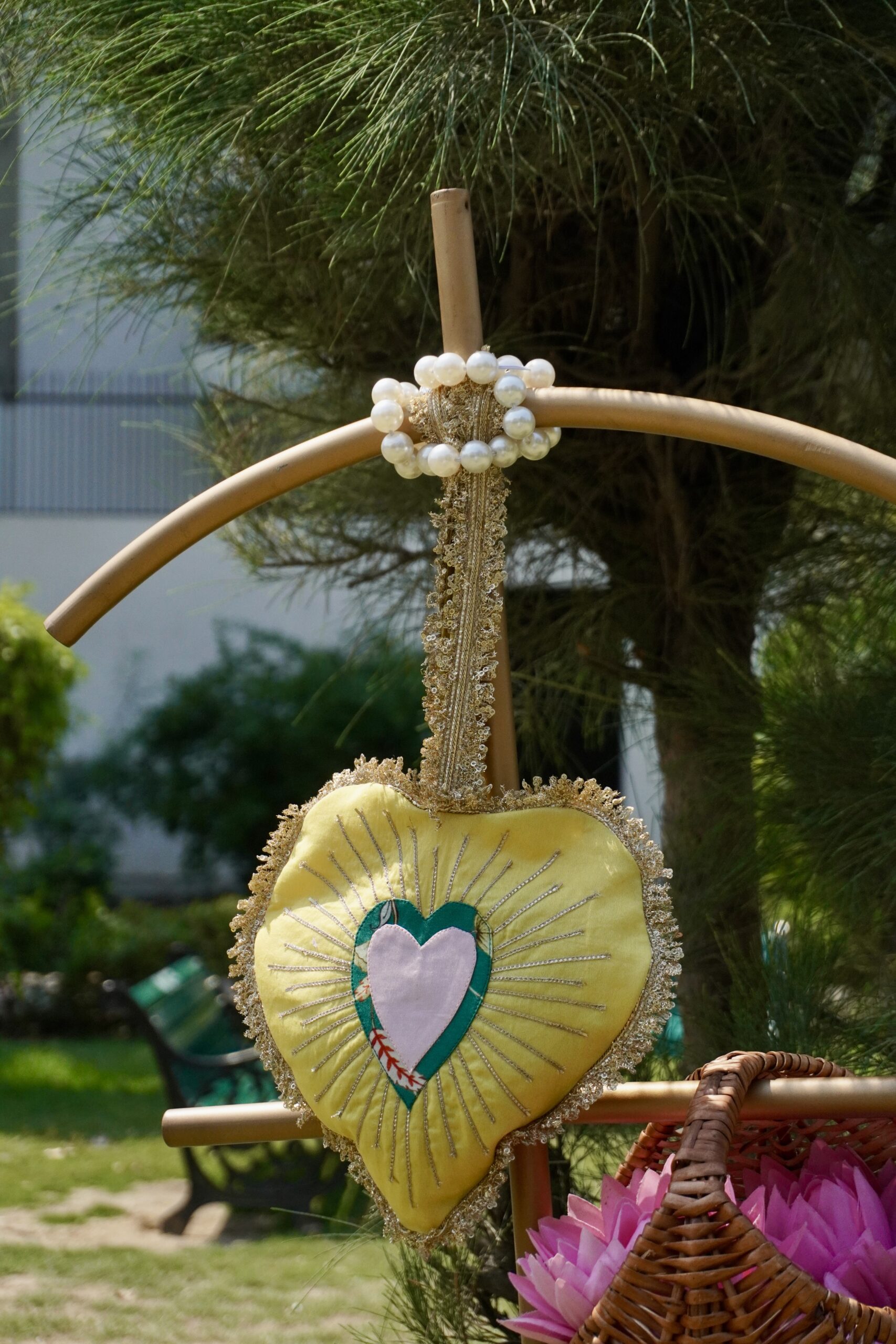 Brighten up your festive look with the Swamini Sunshine Heart Embroidered Potli Bag. Designed in a radiant yellow shade, this potli features a beautifully handcrafted heart motif with intricate embroidery and elegant pearl detailing.